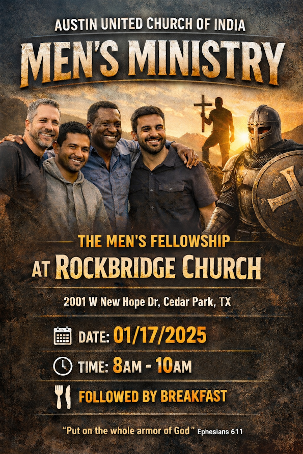 The Men's Ministry seeks God's provision for a life-changing, healthy, fruitful men’s ministry by conducting activities (Word study, discipleship programs, prayer) with focus on equipping men and making disciples. The ministry practices by establishing mentorship programs to guide and support men in their faith journey and planning community service initiatives to volunteer in community projects and continued partnership with the Austin area churches.