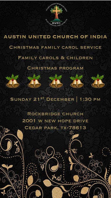 We extend the tradition of observing the Sunday service before Christmas, i.e. 12/21, as Family Carol Service. We light up the candles and groups or families will sing Christmas carols or Christmas songs including in Indian regional languages - Telugu, Hindi, Kannada, Gujarati, and Bangla. All the Sunday school children will be part of the special Christmas program organized every year. Come and be a part of the special service and be blessed.