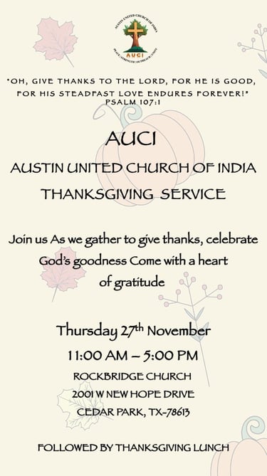 AUCI will host the Thanksgiving Service at 11 am on Thursday, 11/27, at Rockbridge Church facilities. Come join us to give thanks, share a testimony, and enjoy fellowship lunch after the worship service.